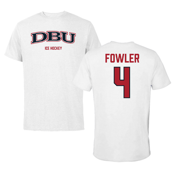 Dallas Baptist University Ice Hockey (M) White Tee - #4 Austin Fowler