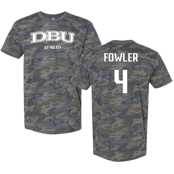 Dallas Baptist University Ice Hockey (M) Vintage Camo Tee - #4 Austin Fowler
