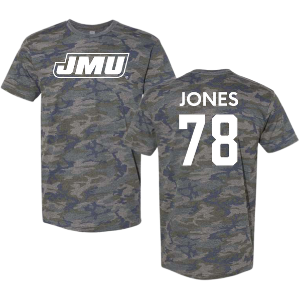 James Madison University Football Vintage Camo Tee - #78 Cameron Jones