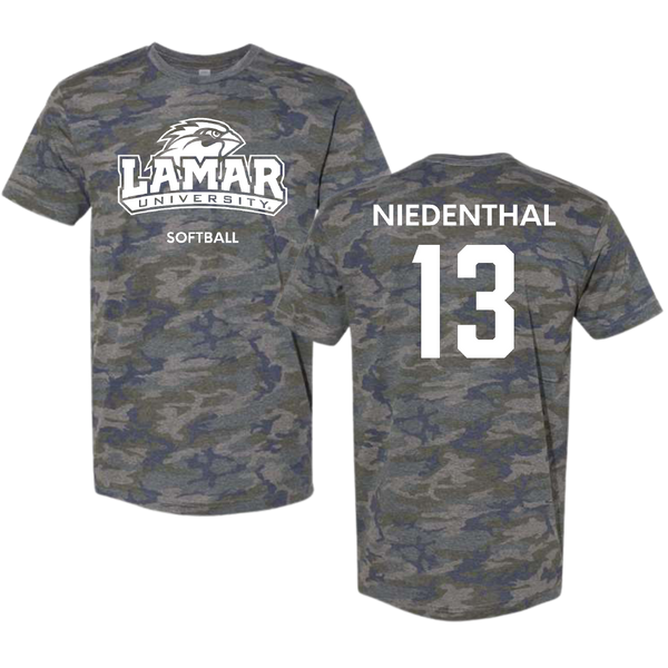 Lamar University Softball Vintage Camo Tee - #13 Cameron Niedenthal