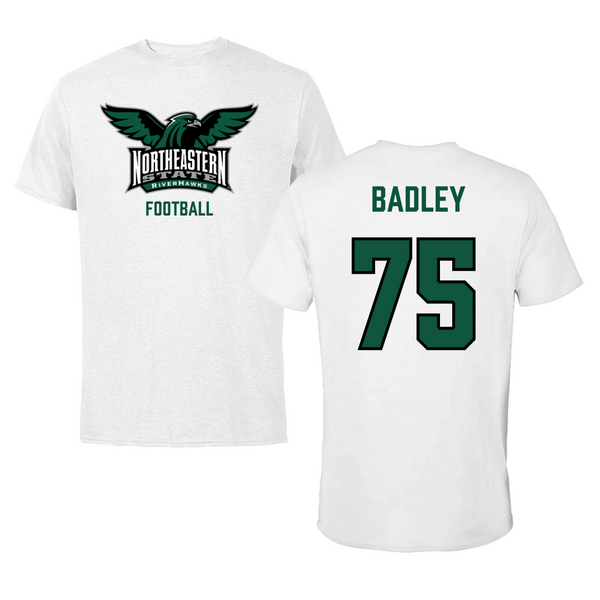 Northeastern State University Football White Tee - #75 Cayson Badley