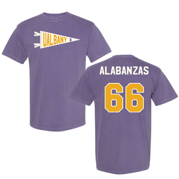 University at Albany Football Purple Pennant Comfort Colors Tee - #66 Christopher Alabanzas