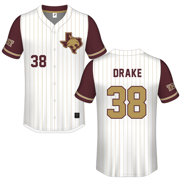 Texas State University White Pinstripe Button-Down Jersey - #38 Colten Drake