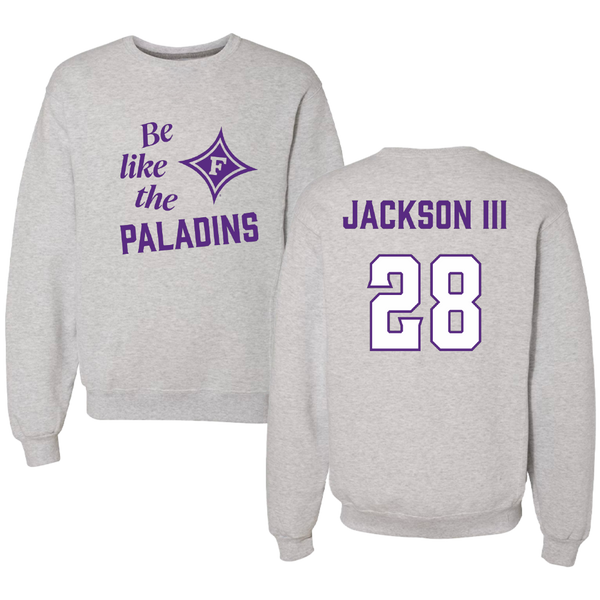 Furman University Football Light Gray Be Like Us Crewneck - #28 Eddie Jackson III