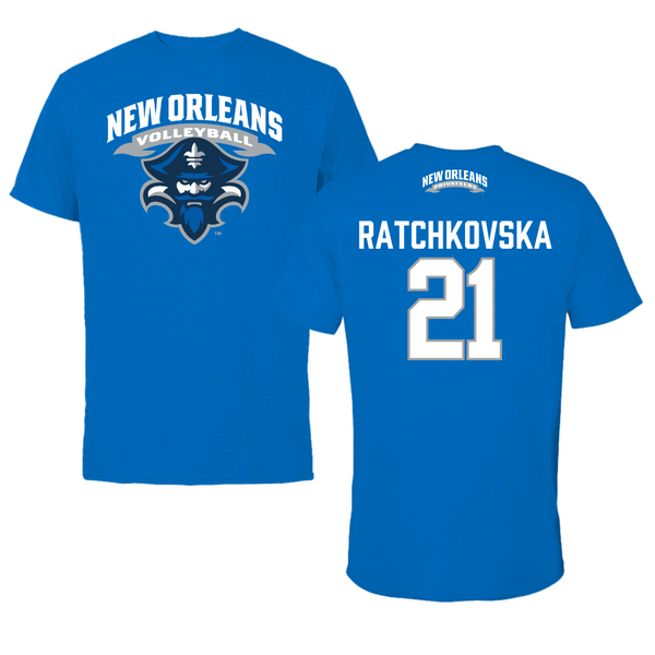 University of New Orleans Volleyball Blue Mascot Tee - #21 Elani Ratchkovska
