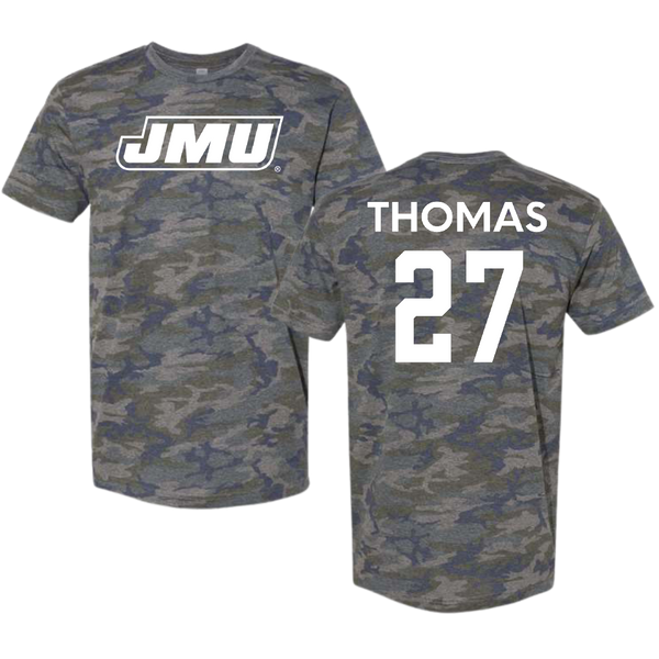 James Madison University Football Vintage Camo Tee - #27 Jacob Thomas