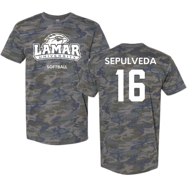 Lamar University Softball Vintage Camo Tee - #16 Jayne Sepulveda