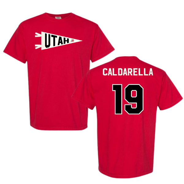 University of Utah Football Red Pennant Comfort Colors Tee - #19 Luca Caldarella