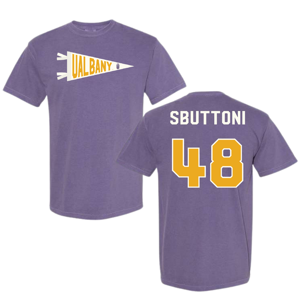 University at Albany Football Purple Pennant Comfort Colors Tee - #48 Michael Sbuttoni