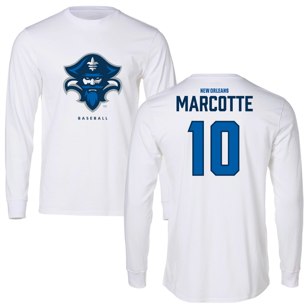 University of New Orleans Baseball White Long Sleeve - #10 Riley Marcotte