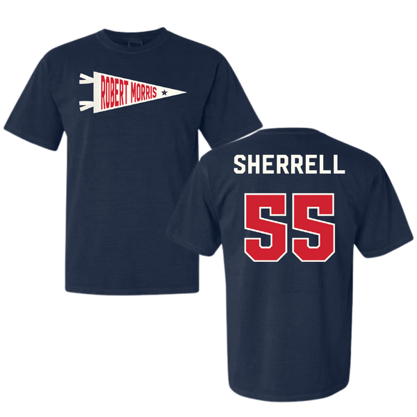 Robert Morris University Football Navy Pennant Comfort Colors Tee - #55 Tayvon Sherrell