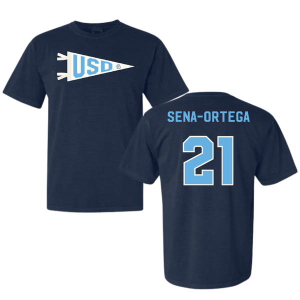 University of San Diego Football Navy Pennant Comfort Colors Tee - #21 Trey Sena-Ortega