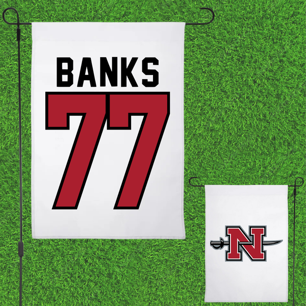 Nicholls State University Football White Garden Flag - #77 Cam Banks