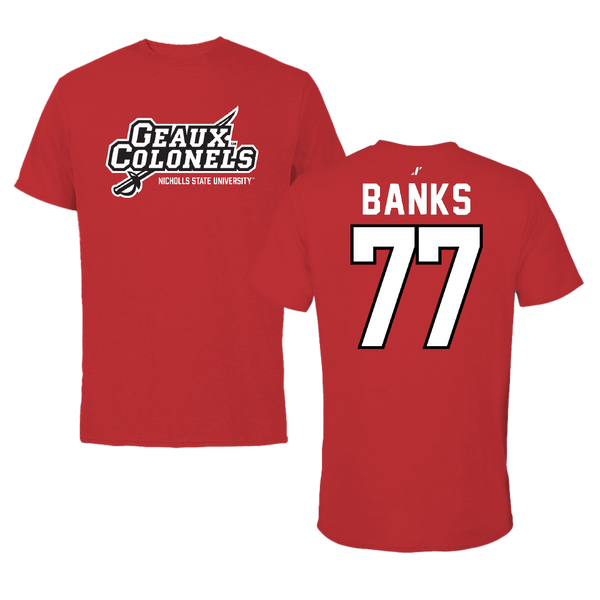 Nicholls State University Football Red Tee - #77 Cam Banks