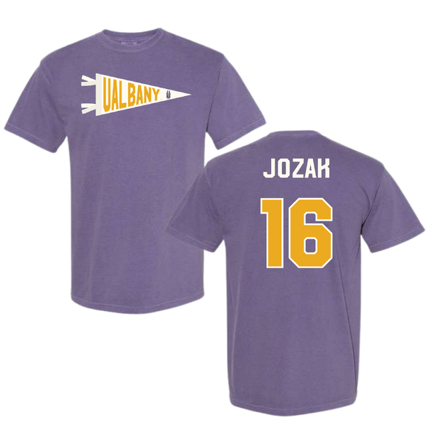 University at Albany Soccer Purple Pennant Comfort Colors Tee - #16 Emily Jozak