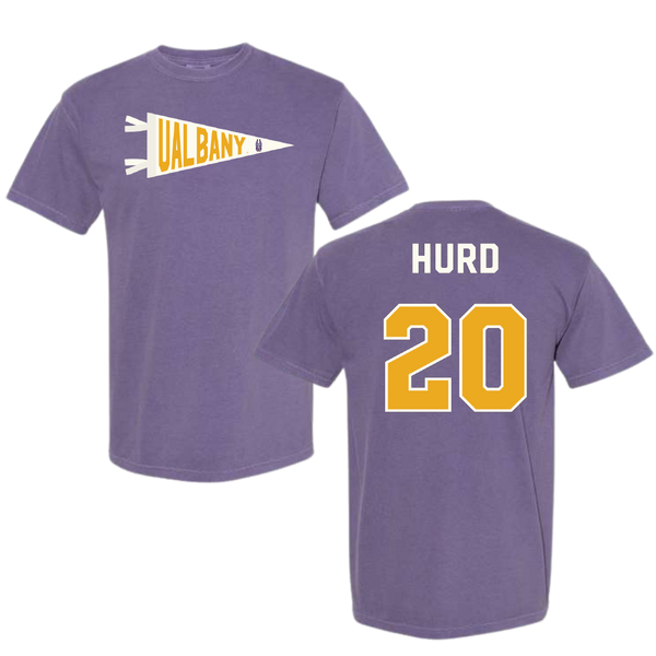 University at Albany Baseball Purple Pennant Comfort Colors Tee - #20 Justin Hurd